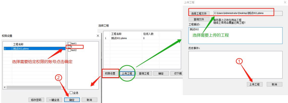 3. 协同工程的上传:登入主账号(主账号:admin 密码:admin),设计师可以把深化好的三维模型上传到服务器上,并在权限设置那里给同一组员的其他设计师的账号设置进入工程的权限,当设置完权限之后,组员才能看到上传的工程,之后退出主账号用个人账号进行登入(注意:主账号只用来上传工程和设置权限,正常配模还是切换到个人的账号),双击上传的工程后选择协同工程的保存路径进入协同配模。