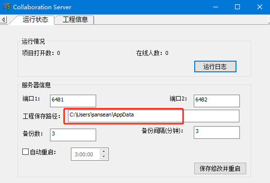 1. 协同服务器的启动:在登入协同账号之前,需要先确保协同功能的服务器处于开启状态:首先选择PKPM-LMB下命令实时协同服务器,然后选择打开工程或者新建工程,软件就会弹出协同服务器的运行提示框,可以根据需要设置工程的保存路径以及文件的自动备份间隔时间,在设置好后可直接点击“保存修改并重启”,然后关闭提示框(一个项目只需一台电脑开启服务器作为主机)。