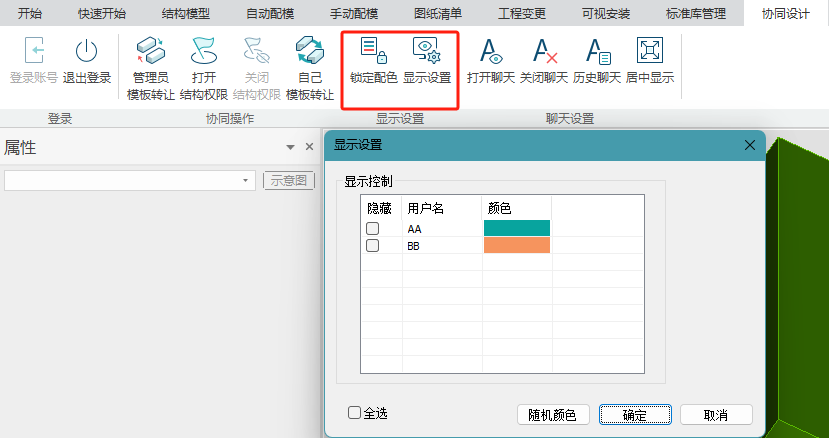 显示设置和锁定配色:由于在协同模式下其他人配的模板都能在自己的电脑上实时显示出来,为了更好的区分各自的模板,可以在“显示设置”那里设置其他人的模板颜色,然后点击“锁定配色”即可实现用不同的颜色来区分各自的模板。