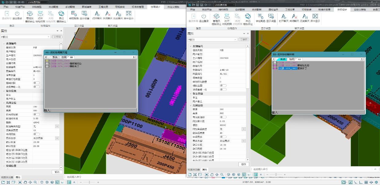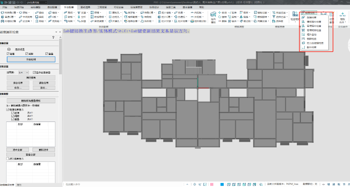 2. 交接检查:当配模完成后便可进行交接位置的检查了,交接检查可以继续在协同模式下进行,按照分工检查的方式对碰撞检查、漏布检查、边框孔检查、拉力丝孔检查等进行检查,由于检查的结果不会同步,分工检查之后可以分工修改,每人改其中一项。
