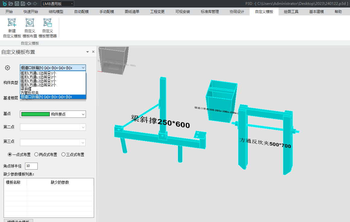 - 模板布置:选择布置方式是一点布置、两点布置、三点布置,选择定位点布置模板,布置完成。