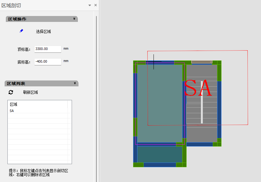 点击“区域剖切”,设置剖切顶标高及底标高,绘图范围内三点绘制剖切显示范围,右键确认对应矩形剖切范围,左侧面板点击剖切名称,显示剖切范围内构件,如图13-3-6。