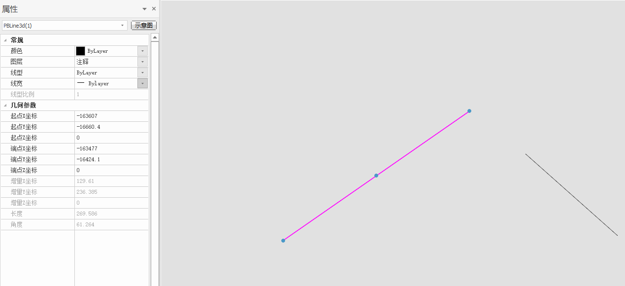 图 14-1-1 点 - 智能画线:启动智能画线命令后,通过鼠标点击或者按下tab键打开追踪器输入的方式指定点的坐标,两点快速绘制出线。绘制完成并选中图形,可以使用属性面板或者夹点对图形进行修改,如图 14-1-2所示。