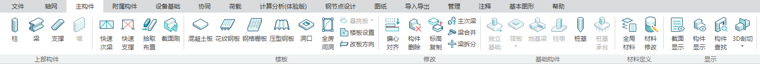 目录 搜索 展开 更新说明20251230版本更新说明更新概要1.协同模块更新点1.1通用机制1.2识图表收资⭐1.2.1操作流程介绍1.2.2功能特点1.3数据收资1.4接口1.4.1工艺协同类软件接口1.4.2计算类软件接口2.上部建模模块更新点2.1通用建模2.1.1工作树⭐2.1.2布置修改2.1.3高分屏适配⭐2.1.4楼板优化2.2快速建模⭐2.2.2快速布置水平撑2.2.1快速悬臂构件2.2.3快速洞边梁2.3智能建模2.3.1设备支架自动布梁2.4附属建模2.4.1直梯栏杆适配参数库模式2.4.2栏杆打断交互⭐3.计算模块更新点3.1荷载导荷3.2振动计算⭐3.3工况优化4.出图模块更新点4.1优化功能4.2新增海外出图模式5.基础模块更新点5.1基础模块更新点⭐5.2设备基础模块更新点5.2.1支持SH/T 3030-2025 石油化工塔型设备基础设计规范⭐5.2.2球形储罐设备及设备基础建模5.2.3支持卧式三支墩建模及计算5.2.4其他更新点1.总体介绍1.1基本功能介绍1.1.1 协同1.1.2 建模1.1.3 计算1.1.4 节点设计1.1.5 出图1.1.6 算量1.2软件界面1.2.1 菜单栏1.2.2 图形空间1.2.3 项目树1.2.4 快捷命令2.轴网2.1导入模型2.1.1导入PMCAD2.1.2增量导入PMcad2.2轴网标高2.2.1轴网标高2.2.2轴网编辑2.2.3标高编辑2.3工作面2.3.1创建工作面2.3.2工作面管理器2.3.3退出工作面2.3.4工作面的快捷按钮2.4修改工具2.4.1移动2.4.2复制2.4.3旋转2.4.4镜像2.4.5阵列2.4.6删除2.4.7拉伸2.4.8延伸2.4.9起坡2.5测量工具2.5.1测量长度2.5.2测量角度2.5.3测量面积2.5.4测量标高2.5.5测量坐标3.主构件3.1上部构件3.1.1柱3.1.2梁3.1.3支撑3.1.4快速次梁3.1.5快速支撑3.1.6拾取布置3.1.7截面刷3.2楼板3.2.1混凝土板3.2.2花纹钢板3.2.3钢格栅板3.2.4压型钢板3.2.5洞口3.2.6全房间洞3.2.7楼板设置3.2.8改板方向3.3修改3.3.1偏心对齐3.3.2构件删除3.3.3标高复制3.3.4主次梁3.3.5梁合并3.3.6梁拆分3.4基础构件3.4.1桩基3.5材料定义3.5.1全局材料3.5.2材料修改3.6显示3.6.1截面显示3.6.2构件显示3.6.3构件查找3.6.43D剖切3.6.5退出剖切4.附属构件4.1楼梯栏杆4.1.1钢直梯4.1.2钢斜梯4.1.3栏杆4.2附加构件4.2.1预埋件4.2.2地脚螺栓4.2.3翻边4.2.4钢平台4.2.5钢通道4.2.6支墩4.2.7支架4.2.8支吊架4.2.9T型支架4.2.10板式支架5.设备基础5.1收资5.1.1设备条件5.2地质资料5.2.1地质资料5.3总参5.3.1统一规定5.3.2自动生成基础规则5.4设备基础5.4.1卧式冷换设备基础5.4.2卧式容器基础5.4.3塔型设备基础5.4.4立式容器基础5.4.6管墩基础5.5设备支架5.5.1立式设备支架5.5.2卧式设备支架5.6汇总表5.6.1设备基础汇总表5.7计算6.协同6.1设备条件6.2工艺提资6.2.1荷载收资6.2.2洞口收资6.2.3埋件收资6.3智能生成6.3.1自动布梁6.4专业协同6.4.1发布设置6.4.2发布版本6.4.3参照6.5链接模型6.5.1链接P3D6.5.2链接管理7.荷载7.1荷载设置7.1.1工况管理7.1.2导荷方式7.1.3荷载显示7.2荷载布置7.2.1梁荷载7.2.2柱荷载7.2.3板均布荷载7.2.4板局部荷载7.2.5节点荷载7.3荷载快速布置7.3.1快速布置点荷载7.3.2快速布置线荷载7.3.3快速布置面荷载7.4荷载编辑7.4.1荷载修改7.4.2荷载删除7.4.3荷载清理7.4.4拾取布置7.5约束指定7.5.1支座约束7.5.2杆端约束7.5.3支座约束删除8.计算分析8.1设计层8.1.1模型检查8.1.2划分设计层8.2计算8.2.1生成分析模型8.2.2计算参数8.2.3计算8.3结果8.3.1数检定位8.3.2结果查看9.钢节点设计9.1导入结果9.1.1读取计算9.2设计方式9.3规格化节点设计9.3.1通用参数9.3.2节点配置9.3.3节点生成9.4按内力生成节点9.4.1节点参数9.4.2节点生成9.4.3节点归并9.5修改节点9.5.1节点修改9.5.2节点表修改9.6节点查询9.6.1节点设计结果9.6.2节点计算书9.6.3编号显示9.7内力查看9.8清除数据10.图纸10.1参数10.1.1 文字标准10.1.2 绘图参数10.2生成视图映射10.2.1 平面图10.2.2 立面图10.2.3 大样图10.2.4 节点图10.3填充修改10.4生成图纸10.5清单统计10.5.1 统计参数10.5.2 生成清单10.6导出图纸 暂无相关搜索结果! 3.主构件 主构件主要用于主体结构的创建,包含上部构件梁、柱、撑,混凝土板和钢板,以及基础构件的桩基、筏板、地基梁等。除基本构件布置功能外,此模块下还提供了快速布梁和快速布撑等便捷的建模工具,以及构件布置和属性的快速修改工具。