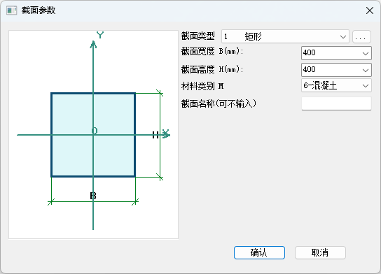 点击【增加】按钮,弹出柱的【截面定义】对话框,可定义梁的截面形状类型、尺寸及材料(混凝土或钢材料),截面名称可不输入。