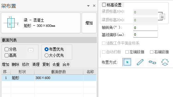 点击菜单中【梁】图标后在屏幕左侧弹出梁布置面板,布置面板由三部分组成:截面参数、截面列表和布置参数mini框。