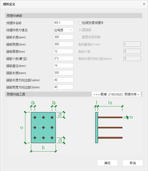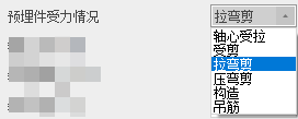 【预埋件受力情况】:目前程序根据图集《16G362》,提供轴心受拉、受剪、拉弯剪、压弯剪、构造、吊筋等多种受力类型的下拉选择,分别对应不同的参数界面,可设定对应的锚板尺寸、锚筋个数及定位等相关参数。