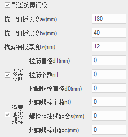 【配置抗剪钢板】【设置拉筋】【设置地脚螺栓】:当预埋件按压弯剪配置,可复选此三项,并为之设置对应的参数。