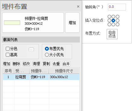 点击菜单中【预埋件】图标后,在屏幕左侧弹出预埋件的布置面板。布置面板由三部分组成:截面参数、截面列表和布置参数mini框。