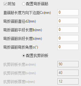 【附加】当预埋件按受剪配置,可勾选“附加”选项,此时可单选配置弯折锚筋或是抗剪钢板,并为之设置对应的参数。