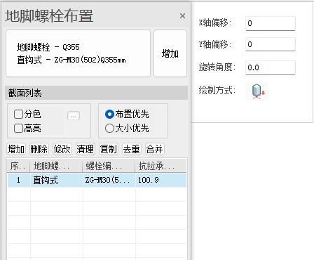 点击菜单中【地脚螺栓】图标后,在屏幕左侧弹出地脚螺栓的布置面板。布置面板由三部分组成:截面参数、截面列表和布置参数mini框。