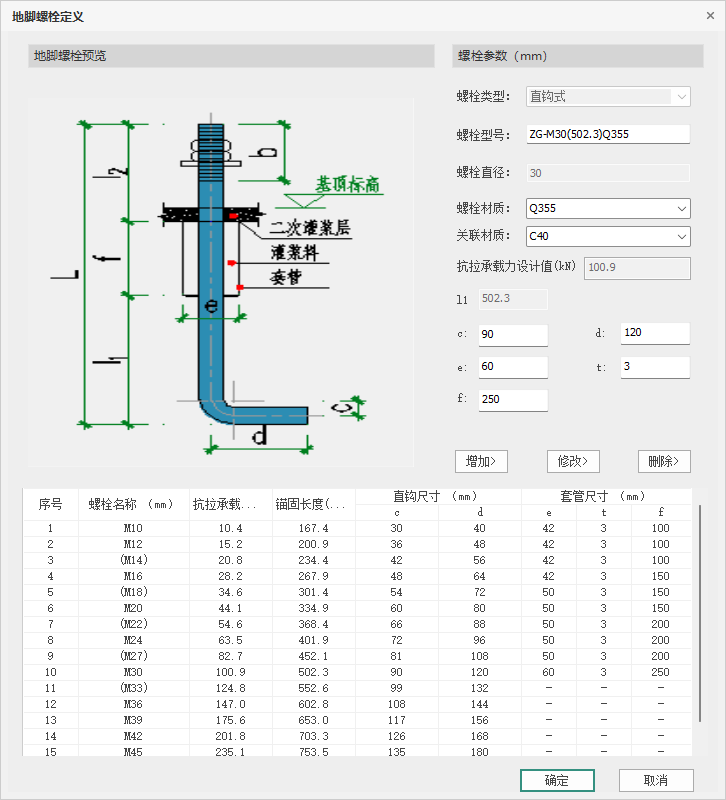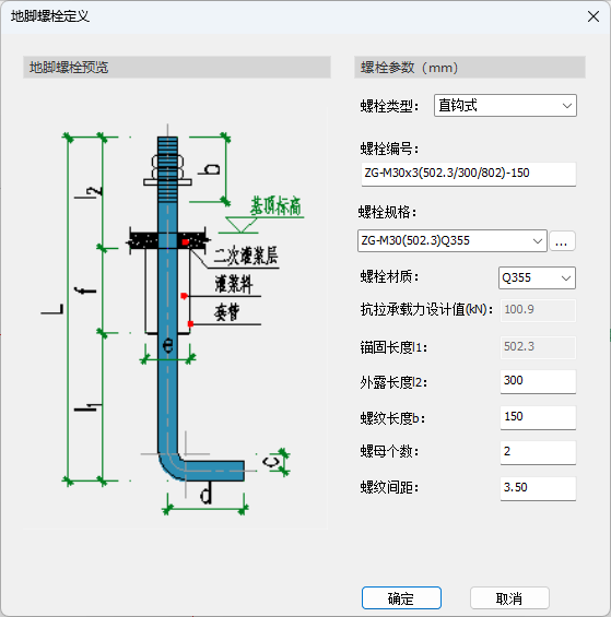 点击【增加】按钮,弹出地脚螺栓的【截面定义】对话框,如图所示,可定义地脚螺栓的类型、编号、规格、长度等相关参数。