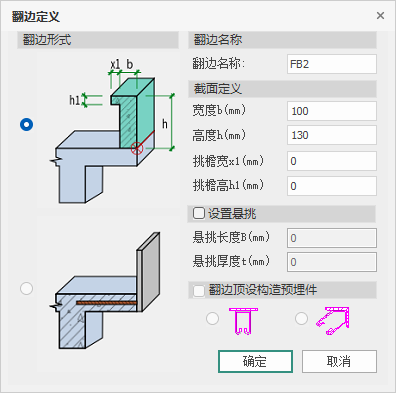 【设置悬挑】:开关默认不勾选。勾选后,输入“悬挑长度”及“悬挑厚度”,悬挑长度需大于等于翻边宽度b,悬挑厚度需大于等于与主体结构毗邻边的板厚。