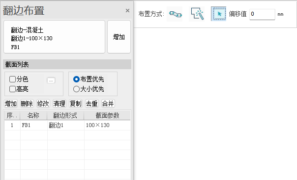 点击菜单中【翻边】图标后,在屏幕左侧弹出翻边的布置面板。布置面板由三部分组成:截面参数、截面列表和布置参数mini框。