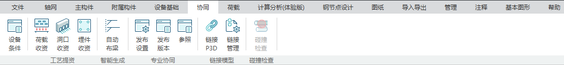 目录 搜索 展开 更新说明20251230版本更新说明更新概要1.协同模块更新点1.1通用机制1.2识图表收资⭐1.2.1操作流程介绍1.2.2功能特点1.3数据收资1.4接口1.4.1工艺协同类软件接口1.4.2计算类软件接口2.上部建模模块更新点2.1通用建模2.1.1工作树⭐2.1.2布置修改2.1.3高分屏适配⭐2.1.4楼板优化2.2快速建模⭐2.2.2快速布置水平撑2.2.1快速悬臂构件2.2.3快速洞边梁2.3智能建模2.3.1设备支架自动布梁2.4附属建模2.4.1直梯栏杆适配参数库模式2.4.2栏杆打断交互⭐3.计算模块更新点3.1荷载导荷3.2振动计算⭐3.3工况优化4.出图模块更新点4.1优化功能4.2新增海外出图模式5.基础模块更新点5.1基础模块更新点⭐5.2设备基础模块更新点5.2.1支持SH/T 3030-2025 石油化工塔型设备基础设计规范⭐5.2.2球形储罐设备及设备基础建模5.2.3支持卧式三支墩建模及计算5.2.4其他更新点1.总体介绍1.1基本功能介绍1.1.1 协同1.1.2 建模1.1.3 计算1.1.4 节点设计1.1.5 出图1.1.6 算量1.2软件界面1.2.1 菜单栏1.2.2 图形空间1.2.3 项目树1.2.4 快捷命令2.轴网2.1导入模型2.1.1导入PMCAD2.1.2增量导入PMcad2.2轴网标高2.2.1轴网标高2.2.2轴网编辑2.2.3标高编辑2.3工作面2.3.1创建工作面2.3.2工作面管理器2.3.3退出工作面2.3.4工作面的快捷按钮2.4修改工具2.4.1移动2.4.2复制2.4.3旋转2.4.4镜像2.4.5阵列2.4.6删除2.4.7拉伸2.4.8延伸2.4.9起坡2.5测量工具2.5.1测量长度2.5.2测量角度2.5.3测量面积2.5.4测量标高2.5.5测量坐标3.主构件3.1上部构件3.1.1柱3.1.2梁3.1.3支撑3.1.4快速次梁3.1.5快速支撑3.1.6拾取布置3.1.7截面刷3.2楼板3.2.1混凝土板3.2.2花纹钢板3.2.3钢格栅板3.2.4压型钢板3.2.5洞口3.2.6全房间洞3.2.7楼板设置3.2.8改板方向3.3修改3.3.1偏心对齐3.3.2构件删除3.3.3标高复制3.3.4主次梁3.3.5梁合并3.3.6梁拆分3.4基础构件3.4.1桩基3.5材料定义3.5.1全局材料3.5.2材料修改3.6显示3.6.1截面显示3.6.2构件显示3.6.3构件查找3.6.43D剖切3.6.5退出剖切4.附属构件4.1楼梯栏杆4.1.1钢直梯4.1.2钢斜梯4.1.3栏杆4.2附加构件4.2.1预埋件4.2.2地脚螺栓4.2.3翻边4.2.4钢平台4.2.5钢通道4.2.6支墩4.2.7支架4.2.8支吊架4.2.9T型支架4.2.10板式支架5.设备基础5.1收资5.1.1设备条件5.2地质资料5.2.1地质资料5.3总参5.3.1统一规定5.3.2自动生成基础规则5.4设备基础5.4.1卧式冷换设备基础5.4.2卧式容器基础5.4.3塔型设备基础5.4.4立式容器基础5.4.6管墩基础5.5设备支架5.5.1立式设备支架5.5.2卧式设备支架5.6汇总表5.6.1设备基础汇总表5.7计算6.协同6.1设备条件6.2工艺提资6.2.1荷载收资6.2.2洞口收资6.2.3埋件收资6.3智能生成6.3.1自动布梁6.4专业协同6.4.1发布设置6.4.2发布版本6.4.3参照6.5链接模型6.5.1链接P3D6.5.2链接管理7.荷载7.1荷载设置7.1.1工况管理7.1.2导荷方式7.1.3荷载显示7.2荷载布置7.2.1梁荷载7.2.2柱荷载7.2.3板均布荷载7.2.4板局部荷载7.2.5节点荷载7.3荷载快速布置7.3.1快速布置点荷载7.3.2快速布置线荷载7.3.3快速布置面荷载7.4荷载编辑7.4.1荷载修改7.4.2荷载删除7.4.3荷载清理7.4.4拾取布置7.5约束指定7.5.1支座约束7.5.2杆端约束7.5.3支座约束删除8.计算分析8.1设计层8.1.1模型检查8.1.2划分设计层8.2计算8.2.1生成分析模型8.2.2计算参数8.2.3计算8.3结果8.3.1数检定位8.3.2结果查看9.钢节点设计9.1导入结果9.1.1读取计算9.2设计方式9.3规格化节点设计9.3.1通用参数9.3.2节点配置9.3.3节点生成9.4按内力生成节点9.4.1节点参数9.4.2节点生成9.4.3节点归并9.5修改节点9.5.1节点修改9.5.2节点表修改9.6节点查询9.6.1节点设计结果9.6.2节点计算书9.6.3编号显示9.7内力查看9.8清除数据10.图纸10.1参数10.1.1 文字标准10.1.2 绘图参数10.2生成视图映射10.2.1 平面图10.2.2 立面图10.2.3 大样图10.2.4 节点图10.3填充修改10.4生成图纸10.5清单统计10.5.1 统计参数10.5.2 生成清单10.6导出图纸 暂无相关搜索结果! 6.协同 协同设计主要包括设备基础的设备条件收资,荷载、洞口和埋件的工艺收资,基于收资条件或用户手动布置的洞口、埋件、支架等其他专业的需求条件进行自动布梁,以及收资处理后的返资条件的版本发布和发布设置。同时用户也可以本地链接其他专业模型。