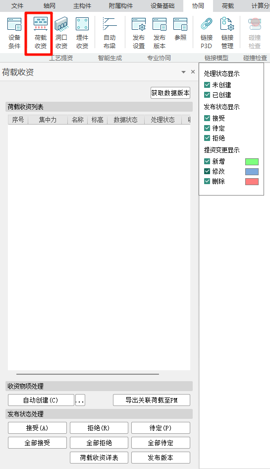 荷载创建后用户可根据具体情况,最终确认提资项是否【接受】、【拒绝】或【待定】,并将处理结果【发布版本】。