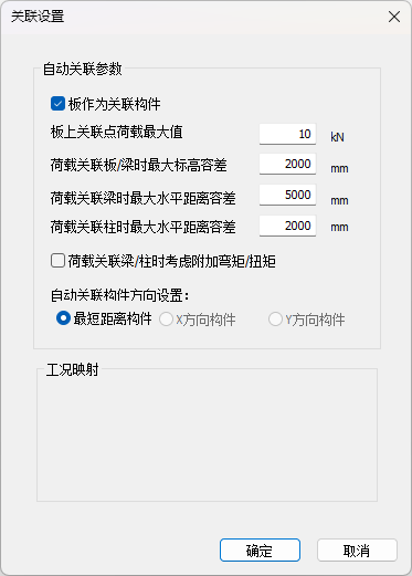获取工艺提资的荷载数据后,可根据【自动创建】旁边的参数设置按钮进入【关联设置】界面,根据用户工程自身情况,设置自动关联的参数。然后点击【自动创建】在模型中创建荷载到结构构件上。