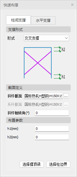 【选择柱边界】:点击此项后依次点击相邻的柱(两柱之间需要可以形成闭合区域),或框选相邻的柱,右键确认后即可在围成闭合区域的两柱之间按界面参数形成支撑。