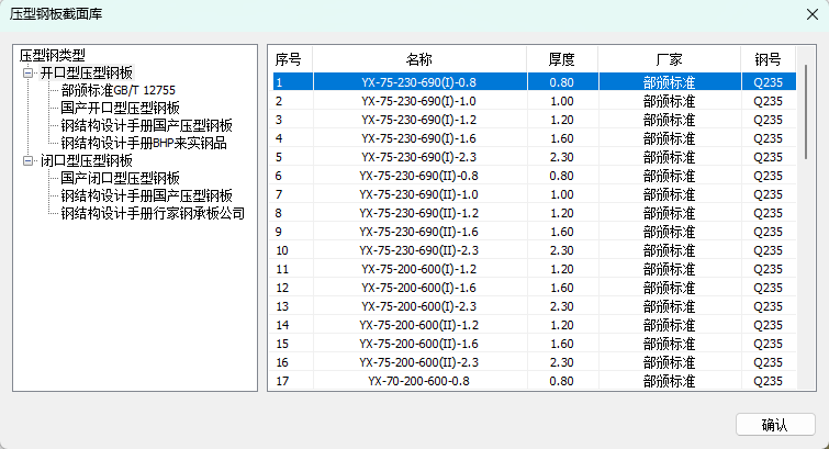 点击【增加】按钮,弹出压型钢板的【压型钢板截面库】对话框,可从中选择已有的截面,暂不支持自定义。