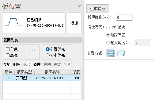 点击菜单中【压型钢板】图标后在屏幕左侧弹出板布置面板,布置面板由三部分组成:截面参数、截面列表和布置参数mini框。