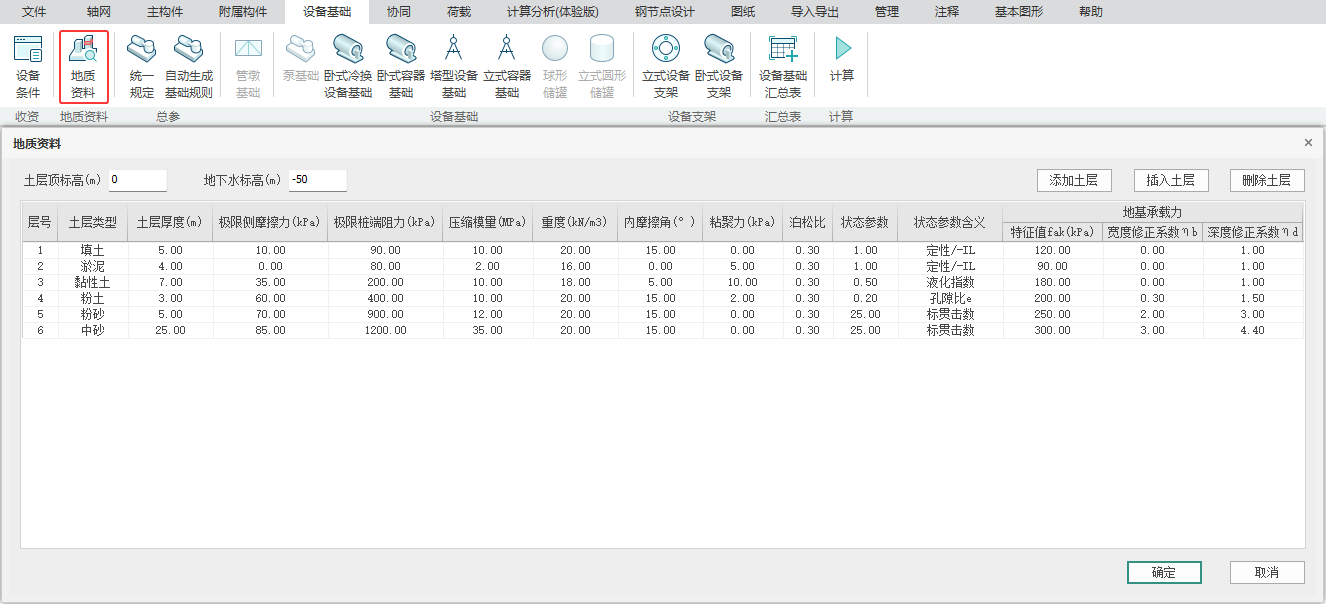地质资料是建筑物周围场地地基状况的描述,是基础设计的重要信息。如果要进行沉降计算,就必须有地质资料数据。通常情况下在进行桩基础的设计时也需要地质资料数据。