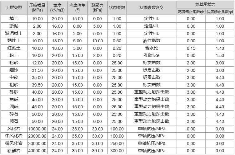 程序内置默认岩土参数如下,通过“土层类型”列可下拉选择土类型,并在默认岩土参数的基础上调整根据工程实际的土质情况对岩土默认参数进行修改,特别是工程所需的岩土类型的土层参数。某层土的参数输完后,可通过“添加土层”按钮输入其它层的参数,也可用“插入土层”、“删除土层”按钮进行土层的调整。