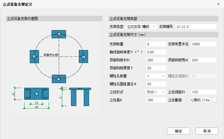 【支架类型】:当前提供有【立式支耳-槽钢】【立式支耳-H型钢】【立式支腿】【环形焊接支座】四种类型的下拉选择,选择不同的立式支架类型时会切换其相应的图示和参数设置。