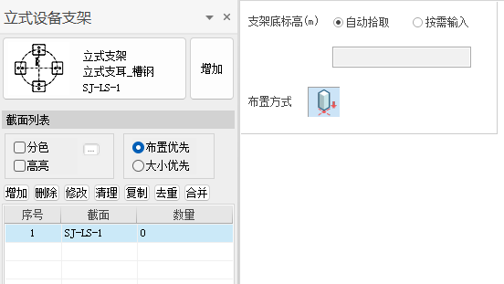 点击菜单中【立式设备支架】图标后,在屏幕左侧弹出立式设备支架的布置面板。布置面板由三部分组成:截面参数、截面列表和布置参数mini框。