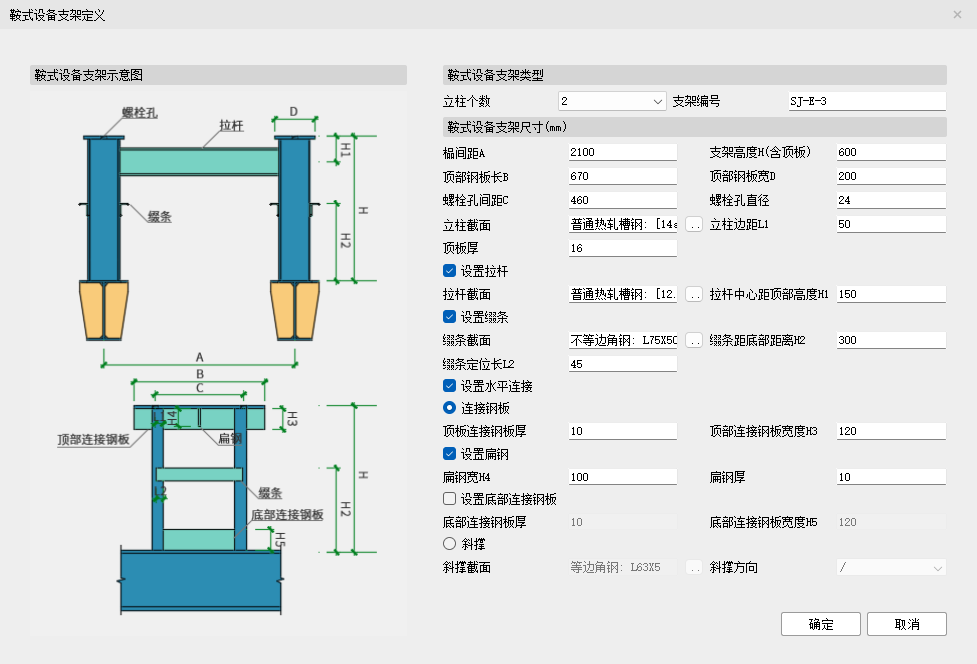 点击【增加】按钮,弹出卧式设备支架的【截面定义】对话框,可通过下拉框定义卧式设备支架的立柱个数及尺寸规格。