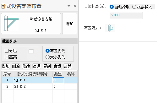 点击菜单中【卧式设备支架】图标后,在屏幕左侧弹出立式设备支架的布置面板。布置面板由三部分组成:截面参数、截面列表和布置参数mini框。