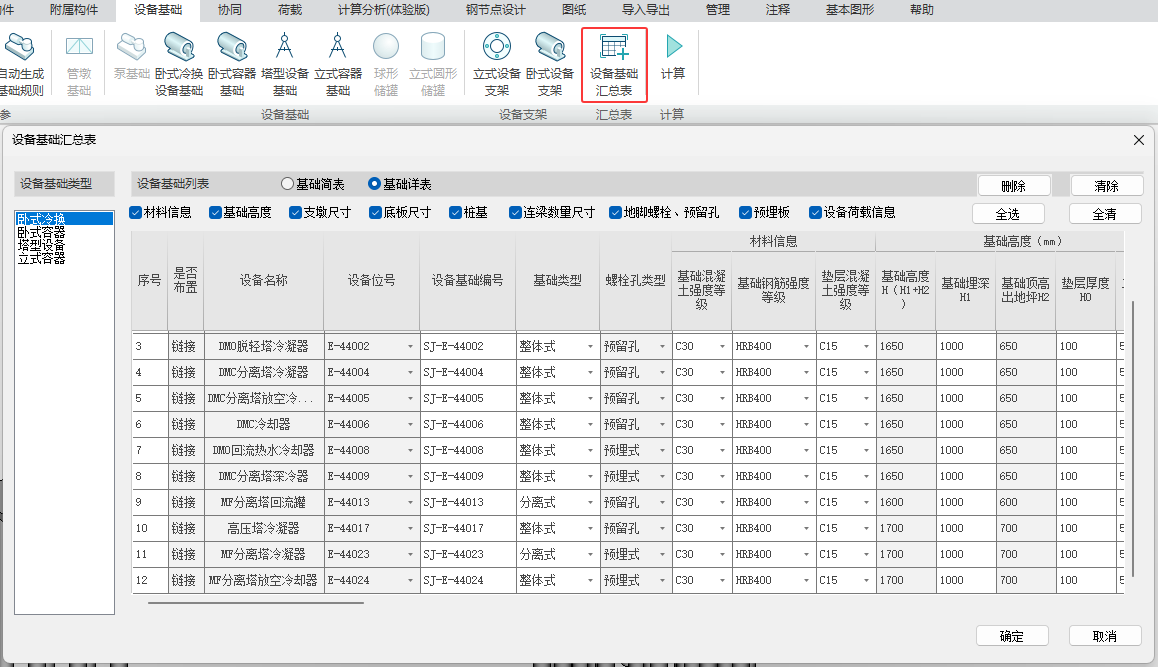目录 搜索 展开 更新说明20251230版本更新说明更新概要1.协同模块更新点1.1通用机制1.2识图表收资⭐1.2.1操作流程介绍1.2.2功能特点1.3数据收资1.4接口1.4.1工艺协同类软件接口1.4.2计算类软件接口2.上部建模模块更新点2.1通用建模2.1.1工作树⭐2.1.2布置修改2.1.3高分屏适配⭐2.1.4楼板优化2.2快速建模⭐2.2.2快速布置水平撑2.2.1快速悬臂构件2.2.3快速洞边梁2.3智能建模2.3.1设备支架自动布梁2.4附属建模2.4.1直梯栏杆适配参数库模式2.4.2栏杆打断交互⭐3.计算模块更新点3.1荷载导荷3.2振动计算⭐3.3工况优化4.出图模块更新点4.1优化功能4.2新增海外出图模式5.基础模块更新点5.1基础模块更新点⭐5.2设备基础模块更新点5.2.1支持SH/T 3030-2025 石油化工塔型设备基础设计规范⭐5.2.2球形储罐设备及设备基础建模5.2.3支持卧式三支墩建模及计算5.2.4其他更新点1.总体介绍1.1基本功能介绍1.1.1 协同1.1.2 建模1.1.3 计算1.1.4 节点设计1.1.5 出图1.1.6 算量1.2软件界面1.2.1 菜单栏1.2.2 图形空间1.2.3 项目树1.2.4 快捷命令2.轴网2.1导入模型2.1.1导入PMCAD2.1.2增量导入PMcad2.2轴网标高2.2.1轴网标高2.2.2轴网编辑2.2.3标高编辑2.3工作面2.3.1创建工作面2.3.2工作面管理器2.3.3退出工作面2.3.4工作面的快捷按钮2.4修改工具2.4.1移动2.4.2复制2.4.3旋转2.4.4镜像2.4.5阵列2.4.6删除2.4.7拉伸2.4.8延伸2.4.9起坡2.5测量工具2.5.1测量长度2.5.2测量角度2.5.3测量面积2.5.4测量标高2.5.5测量坐标3.主构件3.1上部构件3.1.1柱3.1.2梁3.1.3支撑3.1.4快速次梁3.1.5快速支撑3.1.6拾取布置3.1.7截面刷3.2楼板3.2.1混凝土板3.2.2花纹钢板3.2.3钢格栅板3.2.4压型钢板3.2.5洞口3.2.6全房间洞3.2.7楼板设置3.2.8改板方向3.3修改3.3.1偏心对齐3.3.2构件删除3.3.3标高复制3.3.4主次梁3.3.5梁合并3.3.6梁拆分3.4基础构件3.4.1桩基3.5材料定义3.5.1全局材料3.5.2材料修改3.6显示3.6.1截面显示3.6.2构件显示3.6.3构件查找3.6.43D剖切3.6.5退出剖切4.附属构件4.1楼梯栏杆4.1.1钢直梯4.1.2钢斜梯4.1.3栏杆4.2附加构件4.2.1预埋件4.2.2地脚螺栓4.2.3翻边4.2.4钢平台4.2.5钢通道4.2.6支墩4.2.7支架4.2.8支吊架4.2.9T型支架4.2.10板式支架5.设备基础5.1收资5.1.1设备条件5.2地质资料5.2.1地质资料5.3总参5.3.1统一规定5.3.2自动生成基础规则5.4设备基础5.4.1卧式冷换设备基础5.4.2卧式容器基础5.4.3塔型设备基础5.4.4立式容器基础5.4.6管墩基础5.5设备支架5.5.1立式设备支架5.5.2卧式设备支架5.6汇总表5.6.1设备基础汇总表5.7计算6.协同6.1设备条件6.2工艺提资6.2.1荷载收资6.2.2洞口收资6.2.3埋件收资6.3智能生成6.3.1自动布梁6.4专业协同6.4.1发布设置6.4.2发布版本6.4.3参照6.5链接模型6.5.1链接P3D6.5.2链接管理7.荷载7.1荷载设置7.1.1工况管理7.1.2导荷方式7.1.3荷载显示7.2荷载布置7.2.1梁荷载7.2.2柱荷载7.2.3板均布荷载7.2.4板局部荷载7.2.5节点荷载7.3荷载快速布置7.3.1快速布置点荷载7.3.2快速布置线荷载7.3.3快速布置面荷载7.4荷载编辑7.4.1荷载修改7.4.2荷载删除7.4.3荷载清理7.4.4拾取布置7.5约束指定7.5.1支座约束7.5.2杆端约束7.5.3支座约束删除8.计算分析8.1设计层8.1.1模型检查8.1.2划分设计层8.2计算8.2.1生成分析模型8.2.2计算参数8.2.3计算8.3结果8.3.1数检定位8.3.2结果查看9.钢节点设计9.1导入结果9.1.1读取计算9.2设计方式9.3规格化节点设计9.3.1通用参数9.3.2节点配置9.3.3节点生成9.4按内力生成节点9.4.1节点参数9.4.2节点生成9.4.3节点归并9.5修改节点9.5.1节点修改9.5.2节点表修改9.6节点查询9.6.1节点设计结果9.6.2节点计算书9.6.3编号显示9.7内力查看9.8清除数据10.图纸10.1参数10.1.1 文字标准10.1.2 绘图参数10.2生成视图映射10.2.1 平面图10.2.2 立面图10.2.3 大样图10.2.4 节点图10.3填充修改10.4生成图纸10.5清单统计10.5.1 统计参数10.5.2 生成清单10.6导出图纸 暂无相关搜索结果! 5.6.1设备基础汇总表 功能介绍 用户点击“设备基础汇总表”按钮,弹出设备基础汇总表如图,此时展示包括自动生成规则生成的和自定义布置的各类设备基础。程序提供“基础简表”和“基础详表”两种展示方式:“基础简表”展示了设备名称、设备位号、基础类型及设备荷载信息;“基础详表”展示了设备及设备基础的完整信息,并提供表头筛选展示勾选项;用户也可在汇总表中交互修改各参数,需要注意的是,已经“链接”设备的基础不可在汇总表中修改设备信息。