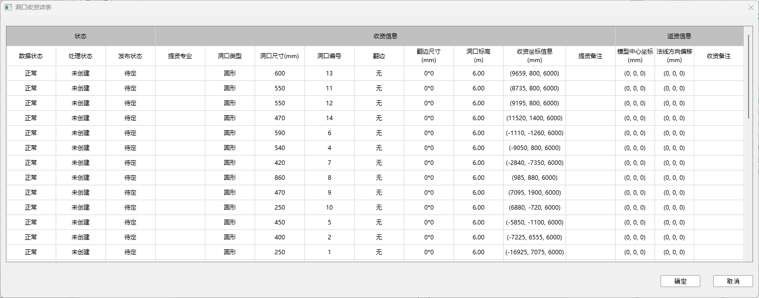 点击【洞口收资详表】,弹出洞口详表界面。用户可在详表中看到收资洞口的详细信息,包括编号、尺寸、坐标等信息。