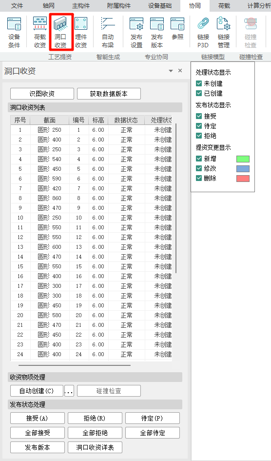 洞口创建后用户可根据具体情况,最终确认提资项是否【接受】、【拒绝】或【待定】,并将处理结果【发布版本】。