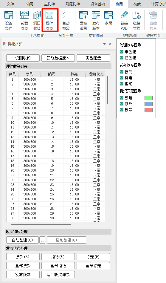 该功能用于工艺专业发布包含埋件及荷载信息的提资条件后,结构专业收取埋件及对应荷载的提资信息,在结构模型中找到可依附的结构构件后,遵循原则创建埋件。