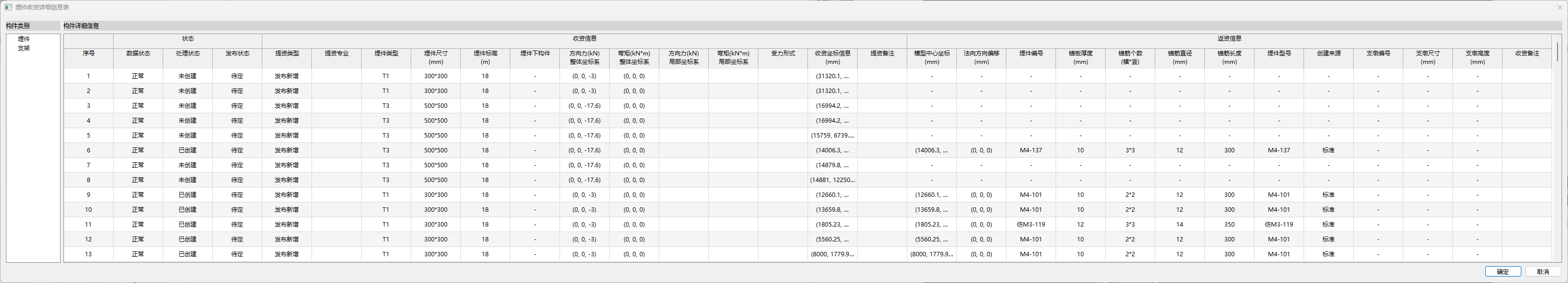 点击【埋件收资详表】,弹出埋件详表界面。用户可在详表中看到收资埋件的详细信息,包括编号、尺寸、坐标等信息。