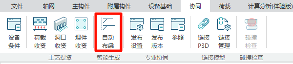 该功能用于结构专业收取其他各提资专业的提资条件,包括洞口、埋件、设备支架以及管道支架等条件信息。依据这些条件信息的特点,在结构模型中智能结构次梁,以方便快捷的自动生成满足提资条件的次梁布置。