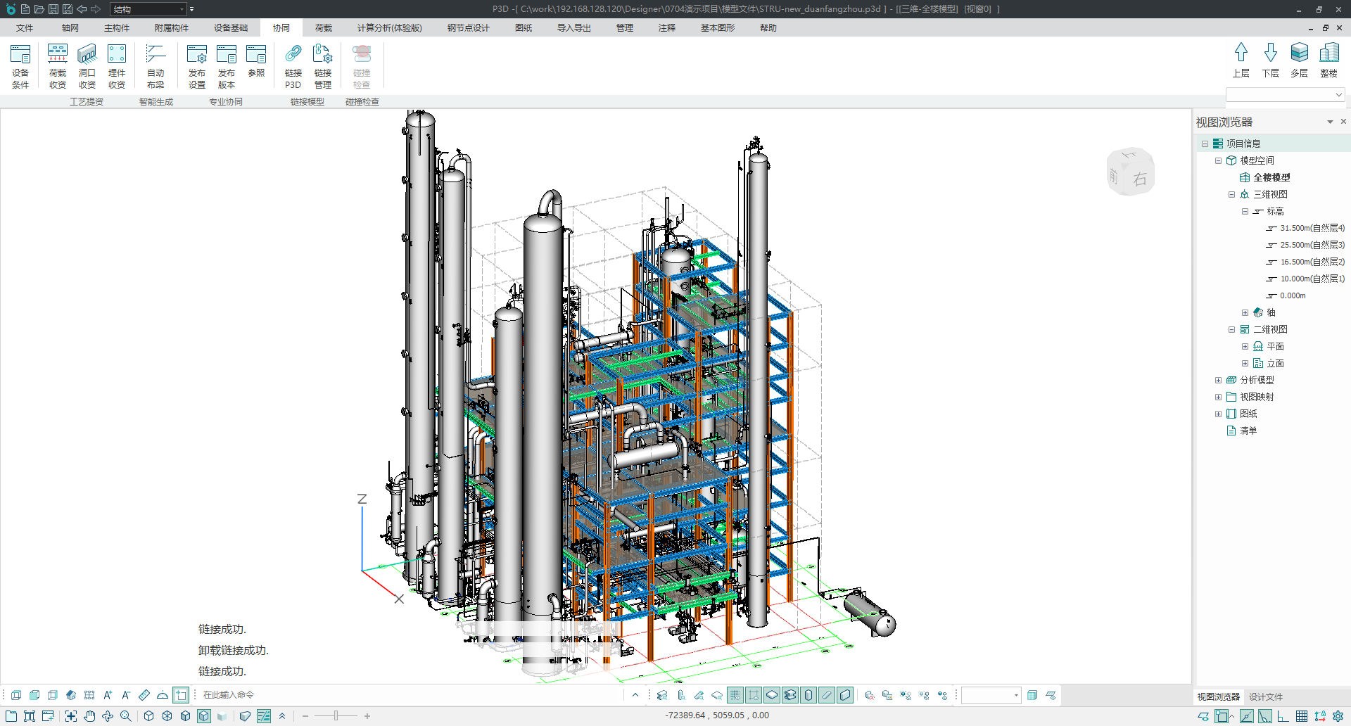 - 选择列表中的模型后,点击【链接】按钮,即可将服务器上的工艺专业模型链接显示到本地结构模型中;