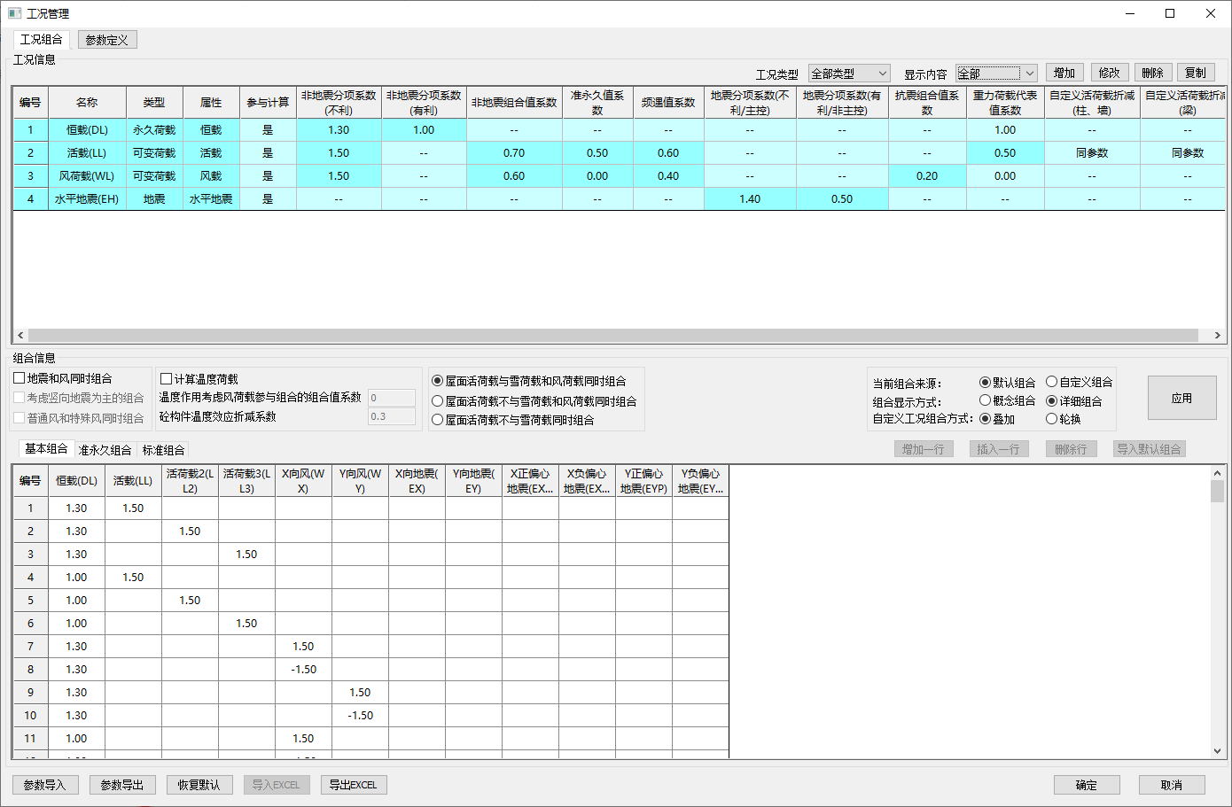 通过工况管理功能,可进行荷载类型的增加、修改、删除、复制等编辑,同时可进行各工况下的荷载分项系数的设置、修改以及组合列表的管理操作。