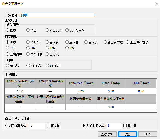右上角,点击“增加”或“修改”,弹出自定义工况定义界面,如下图所示,在该参数框中选择需要新增的荷载类型并设置相应的分项系数,点击“确定”或“连续添加”,自定义工况新建成功。点击“删除”或“复制”,可对选中的工况进行删除或复制操作。