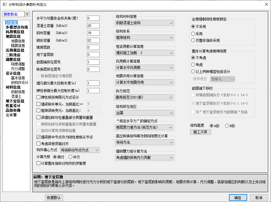 打开“参数定义”标签,如下图,可进行分析和设计参数的补充定义,此部分内容详见《多层及高层建筑结构分析与设计软件 SATWE使用指南》。
