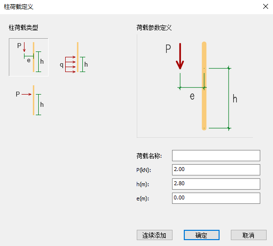 点击【增加】按钮,弹出的【柱荷载定义】对话框,可定义柱荷载的类型、名称及具体大小数值,其中荷载名称可不输入。