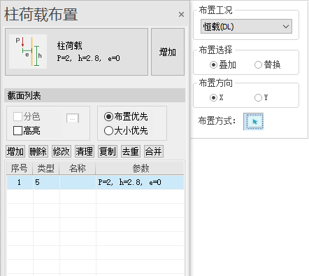 通过荷载列表,可对选中的荷载进行删除、修改、复制、合并等操作;“清理”功能对荷载列表中未布置荷载类型进行清理删除操作;“去重”功能对荷载列表中相同类型及大小的荷载进行去重操作。