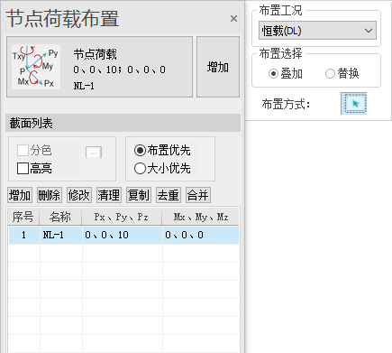 点击荷载布置菜单中【节点荷载】图标后在屏幕左侧弹出节点荷载布置面板,布置面板由三部分组成:荷载参数、荷载列表和布置参数mini框。