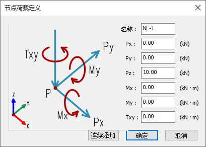点击【增加】按钮,弹出的【节点荷载定义】对话框,可定义节点荷载的名称及具体大小数值,其中荷载名称可不输入。