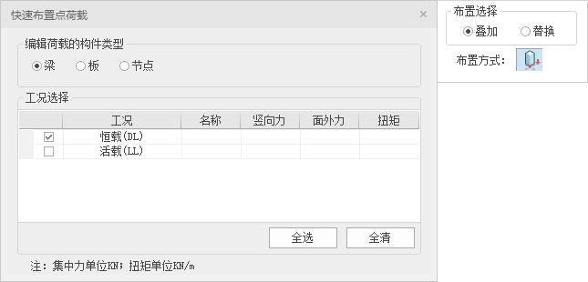 【布置选择】:选择当前布置的荷载为叠加还是替换,前者为当前布置荷载会和构件已布置的荷载叠加作用;后者为当前布置的荷载会替换构件上已布置的荷载。