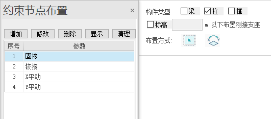 【约束定义列表】面板可完成约束的增加、修改、删除、显示、清理等操作。程序预设给出了“固接”、“铰接”、“X平动”、“Y平动”等4种约束形式。