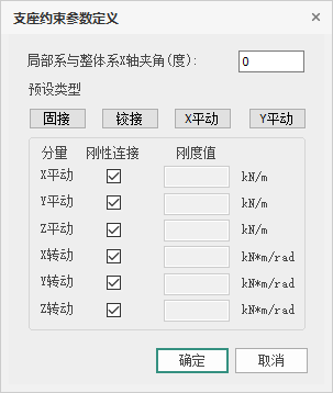 点击“增加”按钮,可打开“支座约束参数定义”对话框,设置各分量的连接属性或刚度值,点击“确定”可完成自定义约束的定义。注意,可通过程序给出的预设类型,快速实现该类型约束的快速定义。