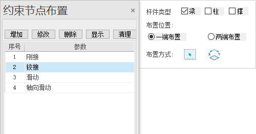 【约束定义列表】面板可完成约束的增加、修改、删除、显示、清理等操作。程序预设给出了“固接”、“铰接”、“滑动”、“轴向滑动”等4种约束形式。
