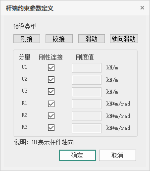 点击“增加”按钮,可打开“支座约束参数定义”对话框,设置各分量的连接属性或刚度值,点击“确定”可完成自定义约束的定义。注意,可通过程序给出的预设类型,快速实现该类型约束的快速定义。