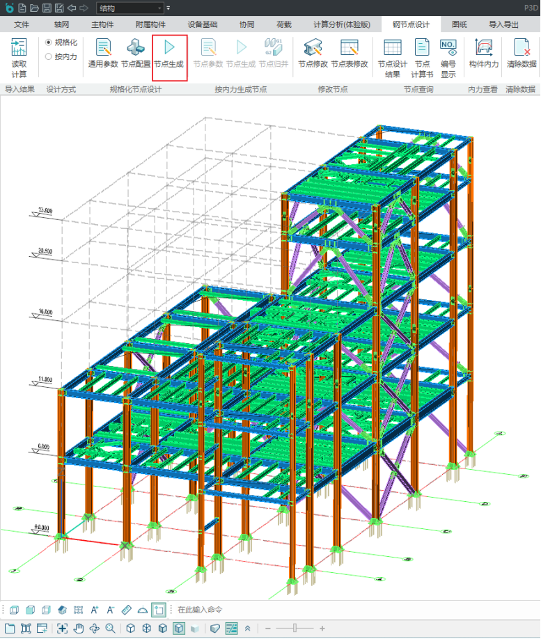 目录 搜索 展开 更新说明20251230版本更新说明更新概要1.协同模块更新点1.1通用机制1.2识图表收资⭐1.2.1操作流程介绍1.2.2功能特点1.3数据收资1.4接口1.4.1工艺协同类软件接口1.4.2计算类软件接口2.上部建模模块更新点2.1通用建模2.1.1工作树⭐2.1.2布置修改2.1.3高分屏适配⭐2.1.4楼板优化2.2快速建模⭐2.2.2快速布置水平撑2.2.1快速悬臂构件2.2.3快速洞边梁2.3智能建模2.3.1设备支架自动布梁2.4附属建模2.4.1直梯栏杆适配参数库模式2.4.2栏杆打断交互⭐3.计算模块更新点3.1荷载导荷3.2振动计算⭐3.3工况优化4.出图模块更新点4.1优化功能4.2新增海外出图模式5.基础模块更新点5.1基础模块更新点⭐5.2设备基础模块更新点5.2.1支持SH/T 3030-2025 石油化工塔型设备基础设计规范⭐5.2.2球形储罐设备及设备基础建模5.2.3支持卧式三支墩建模及计算5.2.4其他更新点1.总体介绍1.1基本功能介绍1.1.1 协同1.1.2 建模1.1.3 计算1.1.4 节点设计1.1.5 出图1.1.6 算量1.2软件界面1.2.1 菜单栏1.2.2 图形空间1.2.3 项目树1.2.4 快捷命令2.轴网2.1导入模型2.1.1导入PMCAD2.1.2增量导入PMcad2.2轴网标高2.2.1轴网标高2.2.2轴网编辑2.2.3标高编辑2.3工作面2.3.1创建工作面2.3.2工作面管理器2.3.3退出工作面2.3.4工作面的快捷按钮2.4修改工具2.4.1移动2.4.2复制2.4.3旋转2.4.4镜像2.4.5阵列2.4.6删除2.4.7拉伸2.4.8延伸2.4.9起坡2.5测量工具2.5.1测量长度2.5.2测量角度2.5.3测量面积2.5.4测量标高2.5.5测量坐标3.主构件3.1上部构件3.1.1柱3.1.2梁3.1.3支撑3.1.4快速次梁3.1.5快速支撑3.1.6拾取布置3.1.7截面刷3.2楼板3.2.1混凝土板3.2.2花纹钢板3.2.3钢格栅板3.2.4压型钢板3.2.5洞口3.2.6全房间洞3.2.7楼板设置3.2.8改板方向3.3修改3.3.1偏心对齐3.3.2构件删除3.3.3标高复制3.3.4主次梁3.3.5梁合并3.3.6梁拆分3.4基础构件3.4.1桩基3.5材料定义3.5.1全局材料3.5.2材料修改3.6显示3.6.1截面显示3.6.2构件显示3.6.3构件查找3.6.43D剖切3.6.5退出剖切4.附属构件4.1楼梯栏杆4.1.1钢直梯4.1.2钢斜梯4.1.3栏杆4.2附加构件4.2.1预埋件4.2.2地脚螺栓4.2.3翻边4.2.4钢平台4.2.5钢通道4.2.6支墩4.2.7支架4.2.8支吊架4.2.9T型支架4.2.10板式支架5.设备基础5.1收资5.1.1设备条件5.2地质资料5.2.1地质资料5.3总参5.3.1统一规定5.3.2自动生成基础规则5.4设备基础5.4.1卧式冷换设备基础5.4.2卧式容器基础5.4.3塔型设备基础5.4.4立式容器基础5.4.6管墩基础5.5设备支架5.5.1立式设备支架5.5.2卧式设备支架5.6汇总表5.6.1设备基础汇总表5.7计算6.协同6.1设备条件6.2工艺提资6.2.1荷载收资6.2.2洞口收资6.2.3埋件收资6.3智能生成6.3.1自动布梁6.4专业协同6.4.1发布设置6.4.2发布版本6.4.3参照6.5链接模型6.5.1链接P3D6.5.2链接管理7.荷载7.1荷载设置7.1.1工况管理7.1.2导荷方式7.1.3荷载显示7.2荷载布置7.2.1梁荷载7.2.2柱荷载7.2.3板均布荷载7.2.4板局部荷载7.2.5节点荷载7.3荷载快速布置7.3.1快速布置点荷载7.3.2快速布置线荷载7.3.3快速布置面荷载7.4荷载编辑7.4.1荷载修改7.4.2荷载删除7.4.3荷载清理7.4.4拾取布置7.5约束指定7.5.1支座约束7.5.2杆端约束7.5.3支座约束删除8.计算分析8.1设计层8.1.1模型检查8.1.2划分设计层8.2计算8.2.1生成分析模型8.2.2计算参数8.2.3计算8.3结果8.3.1数检定位8.3.2结果查看9.钢节点设计9.1导入结果9.1.1读取计算9.2设计方式9.3规格化节点设计9.3.1通用参数9.3.2节点配置9.3.3节点生成9.4按内力生成节点9.4.1节点参数9.4.2节点生成9.4.3节点归并9.5修改节点9.5.1节点修改9.5.2节点表修改9.6节点查询9.6.1节点设计结果9.6.2节点计算书9.6.3编号显示9.7内力查看9.8清除数据10.图纸10.1参数10.1.1 文字标准10.1.2 绘图参数10.2生成视图映射10.2.1 平面图10.2.2 立面图10.2.3 大样图10.2.4 节点图10.3填充修改10.4生成图纸10.5清单统计10.5.1 统计参数10.5.2 生成清单10.6导出图纸 暂无相关搜索结果! 9.3.3节点生成 节点配置完成后,点击生成按钮,程序将从节点库选取统一的节点设置生成节点,节点生成的同时软件还进行了验算。